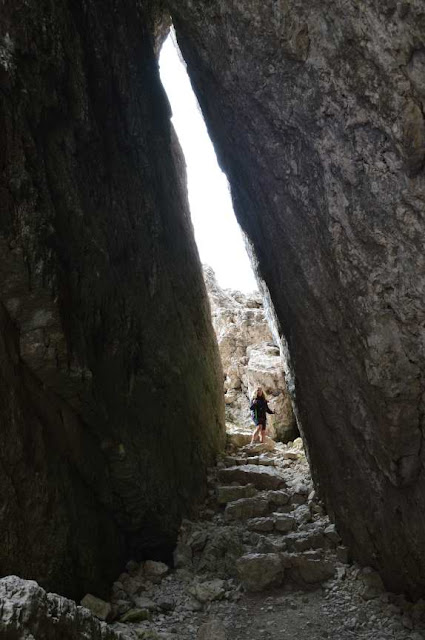 Es superen unes escales i al final d'aquestes, el camí es torna estret, flanquejant tota la base rocosa que formen els cims de Ra Gusela i Nuvolau.