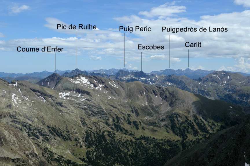 I cap el vessant oriental, els pic de Rulhe, el Puigpedrós de Lanós, el puig Peric, el Carlit,...